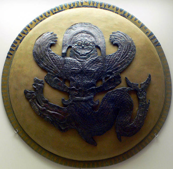 The shield of the Greek soldier bore the device of his state, as the Koppa of Corinth, which was painted on the shields of her citizen-warriors. Interesting devices, frequently animals’ heads, were adopted like coats of arms by Greek nobles, and many of these can be seen on vases of the sixth century. An amphora shows shields decorated with the heads of a bull and a boar. The Dodona warrior carried the so-called Boeotian shield which has depressions in the middle of each side. Various explanations are given of the origin of this form; a probable one is that it results from stretching a hide over an oval frame on which the top and bottom were fastened firmly while the sides were left free and were naturally drawn in by the pull from both ends. Another possibility is that the shield was cut out at the sides to provide peep-holes. [Source: “The Daily Life of the Greeks and Romans”, Helen McClees Ph.D, Gilliss Press, 1924]