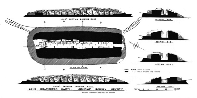 These are followed by “stalled” tombs, rectangular structures with stone piers creating a series of “stalls” down either side, such as the Midhowe tomb on the island of Rousay. These clearly reflect the rectangular buildings with internal stone piers seen at the Ness of Brodgar.