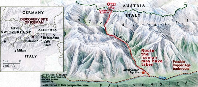 Image Sources: Otzi Museum, Wikimedia Commons, map from National Geographic