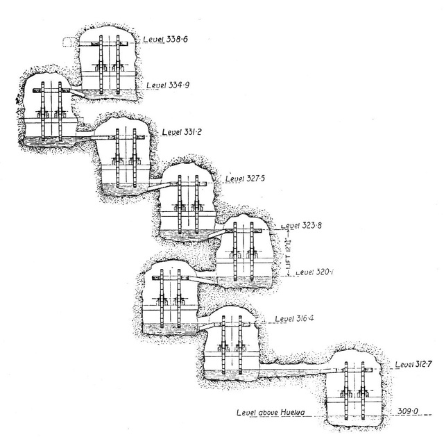 The Romans mined Riotinto by digging shafts of up to 450 feet deep, which required elaborate ventilation and drainage systems, including wooden water wheels and a system of gently sloping drainage channels that remained in use well into the 20th century. They also developed a sophisticated system of governance. Two bronze tablets unearthed at Aljustrel, another Pyrite Belt mine across the Portuguese border, spelled out the rules by which the Roman government would lease Iberia's mines to individual conductores , who paid 50 percent commission on the ore they excavated. The tablets, discovered in 1876 and 1906, also covered mine safety, the treatment of slaves, and the granting of concessions to barbers, auctioneers, and cobblers. Bathhouse owners, who bought franchises, had to keep the water heated year-round, polish the metalwork every month, and admit women and men at specific hours.
