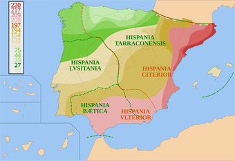 The Roman Republic conquered and occupied territories in the Iberian Peninsula that were previously under the control of native Celtic, Iberian, Celtiberian and Aquitanian tribes and the Carthaginian Empire. The Carthaginian territories in the south and east of the peninsula were conquered in 206 B.C. during the Second Punic War. Control was gradually extended over most of the peninsula without annexations. It was completed after the end of the Roman Republic (27 BC), by Augustus, the first Roman emperor, who annexed the whole of the peninsula to the Roman Empire in 19 B.C.) [Source Wikipedia]