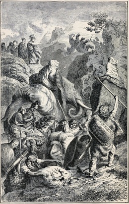 Rome began to be alarmed when Carthage began extending its territory toward the north from southern Spain.. Rome induced Carthage to make a treaty not to extend her conquests beyond the river Iberus (Ebro), in the northern part of Spain. Rome also formed a treaty of alliance with the Greek city of Saguntum, which, though south of the Iberus, was up to this time free and independent. Carthage continued the work of conquering the southern part of Spain, without infringing upon the rights of Rome, until Hasdrubal died. Then Hannibal, the young son of the great Hamilcar, and the idol of the army, was chosen as commander. This young Carthaginian, who had in his boyhood sworn an eternal hostility to Rome, now felt that his mission was come. He marched from New Carthage and proceeded to attack Saguntum, the ally of Rome; and after a siege of eight months, captured it. [Source: “Outlines of Roman History” by William C. Morey, Ph.D., D.C.L. New York, American Book Company (1901) \~]