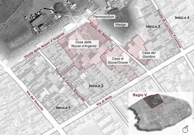 Regio V, Pompeii’s fifth region, where the the first significant excavations at Pompeii in decades began in the early 2010s. Beginning at the Vicolo delle Nozze d’Argento (Street of the Silver Wedding), the excavation have yielded two houses — the House of the Garden and the House of Orion — as well as beautifully-colored frescoes, mosaics of mythological figures, skeletons with stories to tell, a wooden bed, coins, amulets, and a stable of a wealthy landowner with three top-quality horses, one with bronze-plated wooden horns on the saddle and an iron harness with small bronze studs. Excavations in 2018 to stabilize walls in Region V revealed the Alley of the Balconies, a unique alley area where different social classes mixed among modest homes and grand houses with four large second-floor balconies, preserved because they collapsed on a bed of lapilli, or soft pumice, from the volcano’s eruption. One terrace still had amphorae for wine and oil on it. [Source Ruben Montoya, National Geographic History, July 24, 2020]
