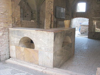 “In one thermopolium, the remains of a cloth bag were discovered in one of the dolia, along with over a thousand coins; these are thought to represent the day's takings and demonstrate the popularity of the establishment. Lararia (domestic shrines) are a fairly common feature of thermopolia, and sometimes depict Mercury and Dionysus, the gods of commerce and wine respectively. |::|