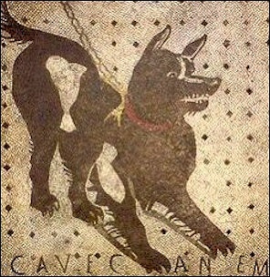 At Pompeii, archaeologists found remains of a chained dog and mosaic with a snarling dog and a sign that said "Cave Canem" (“Beware of the Dog”). Petronius wrote in Satyricon: “There on the left as one entered…was a huge dog with a chain round its neck. It was painted on the wall and over it, in big capitals, was written: Beware of the Dog.” A graffiti inscriptions from Pompeii reads: “On October 17 Puteolana had a litter of three males and two females.”