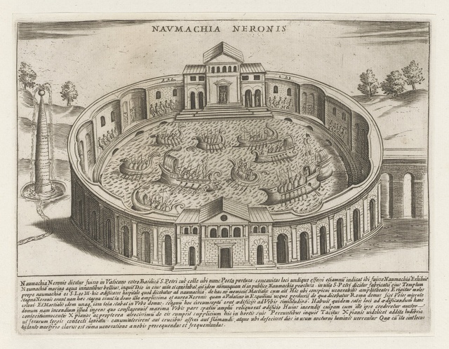 There, two fleets of biremes, triremes, and quadriremes with 4,000 galley slaves and 2,000 crew members on board clashed in a full-scale reconstruction of a naval battle. Roman historian Suetonius, writing in the first century A.D., recorded that people from all over Italy attended. Stalls were set up nearby and the streets filled with sex workers, thieves, and vendors. So many people tried to go that some slept in the street the night before to secure good seats.