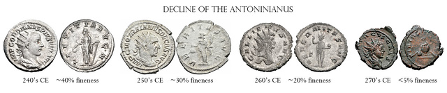 “Interestingly, the continual debasements did not improve the Empire’s fiscal position. This is because of Gresham’s Law (“bad money drives out good”). People would hoard older, high silver content coins and pay their taxes in those with the least silver. Thus the government’s “real” revenues may have actually fallen. As Aurelio Bernardi explains: ‘At the beginning the debasement proved undoubtedly profitable for the state. Nevertheless, in the course of years, this expedient was abused and the century of inflation which had been thus brought about was greatly to the disadvantage of the State’s finances. Prices were rising too rapidly and it became impossible to count on an immediate proportional increase in the fiscal revenue, because of the rigidity of the apparatus of tax collection.’ /=\