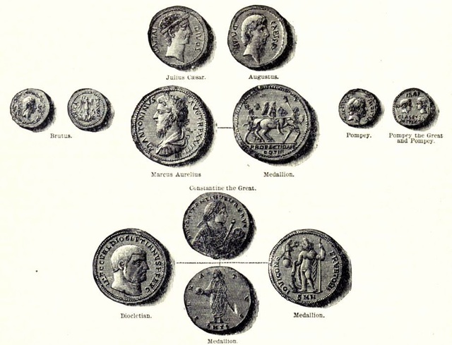 “Throughout most of the Empire, the basic units of Roman coinage were the gold aureus, the silver denarius, and the copper or bronze sesterce. 5 The aureus was minted at 40—42 to the pound, the denarius at 84 to the pound, and a sesterce was equivalent to one-quarter of a denarius. Twenty-five denarii equaled one aureus and the denarius was considered the basic coin and unit of account. /=\