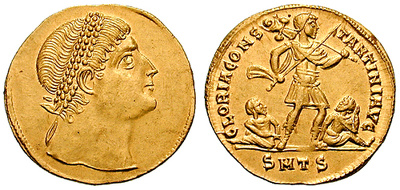 Constantine secures control over the West then the whole Empire (306 - 337): Constantine issues a new gold coin, the Solidus, which continues to be produced in the Eastern Roman Empire unchanged in weight or purity for the next 700 years. [Source: Roy Davies & Glyn Davies, “A History of Money from Ancient Times to the Present Day” by Glyn Davies, rev. ed. Cardiff: University of Wales Press, 1996 & 1999. Exeter]