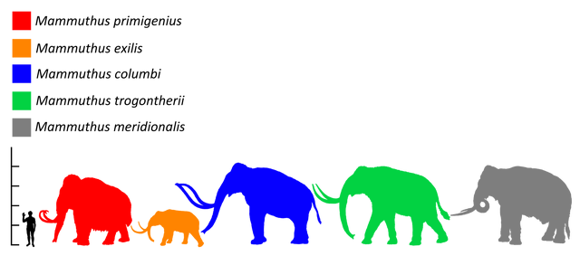 Size comparison of mammoth species (shoulder heights): 1) Red: wooly mammoth, M, primigenius (3,4 meters), 2) orange: pygmy mammoth or Channel Islands mammoth, M, exilis (1,8 meters), 3) blue: Columbian mammoth, M, columbi, 4) green: steppe mammoth, M, trogontherii, and 5) grey: southern mammoth, M, meridionalis (4 meters)