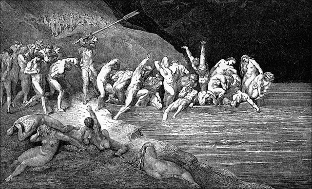 Rivers of the Underworld: 1) Styx: daughter of Oceanus and Tethys; married to Titan Pallas; children: Zelus (‘Zeal'), Nike (‘Victory'), Kratos (‘Strength'), Bia (‘Force') The inviolable oaths which the gods take are sworn by the River Styx (punishment for violation: one year in a coma, nine years in exile) 2) Lethe: (‘Forgetfulness') is very important in Pythagorean doctrines, which believes in the transmigration of souls; drinking the water must be avoided by Orphics, lest they forget their real divine nature and the secret words by which they can reach Persephone. 3) Phlegethon: (‘River of Flames'). 4) Cocytus (‘Wailing'). Charon, the Ferryman, was stationed at the River Styx. Each spirit had to pay him a coin for transportation across the river to the shores of the Fields of Asphodel. The unburied were not allowed to cross.++