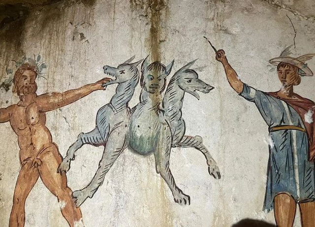 The tomb is now known as the Tomb of Cerberus. Kristina Killgrove wrote in Live Science: Inside the tomb, numerous frescoes adorn the walls. The two ichthyocentaurs may be depictions of Aphros and Bythos, a pair of mythological sea gods who are the personification of sea foam and the ocean abyss. The sea gods are often shown wearing lobster-claw crowns, but on the wall of this tomb, they are reaching toward each other to hold a large shield known as a clipeus. Two winged, Cupid-like babies complete the scene.The tomb is also covered in painted garlands and features a stunning painting of Cerberus, the mythical three-headed dog who guarded the Roman underworld, who is being captured by the demigod Hercules in the last of his 12 labors. The god Mercury, identifiable by his winged hat, stands nearby.Also included in the tomb are an altar on which family members could leave gifts for the dead, as well as the funeral beds themselves, on which the deceased still rest.