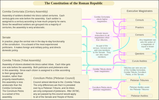 The government of the Roman Republic comprised three elements: a system of magistrates, a Senate, and a number of popular assemblies. According to the Gale Encyclopedia of World History: Governments: The executive office was held by two annually elected consuls who served as chief magistrates and held imperium (absolute power). The consuls acted as head of the Republic, commanded the army, presided over the Senate and assemblies, executed decrees, and represented the Republic in foreign affairs. During times of emergency one consul could be appointed dictator for no longer than six months. The two consuls had veto power over one another, thus limiting their authority. The consuls were typically generals drawn from aristocratic families. After serving their one-year term (they could not be reelected for ten years), the consuls were often appointed to the Senate or to provincial governorships. [Source: Gale Encyclopedia of World History: Governments, Encyclopedia.com]