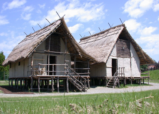 “Because the Terramare people seemed to lay their villages out in grid systems, and favored the digging of deep ditches around their settlements, some romance minded early Italian archaeologists thought of them as Proto-Romans (because Roman colonies and military camps were laid out on a grid and surrounded by a ditch and a palisade). The outstanding characteristic of their towns, from which their name derives, is that they built their huts upon piles or terraces on the banks of rivers. But the fact is, of course, that the later pattern of Roman towns and camps had nothing to do with how these prehistoric people lived. It is with these people, though. that the debate between the proponents of the invasion or immigration pattern and those who favor the local development model heats up. The standard line holds that the Terramare people are immigrants from the Danube River valley area, and that they are speakers of a dialect of Indo-European.