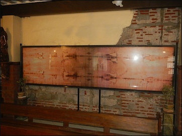 The Shroud of Turin is a mysterious 4.34-meter-long (14-foot-3-inch-long), 1.09-meter-wide (3-foot-7-inch-wide) piece of ivory-colored linen that is believed to be the shroud in which Christ's body was wrapped after the crucifixion. Imprinted on the shroud is a brownish-yellowish outline of a naked bearded man, with long hair and his hands modestly covering his groin, said to be Jesus Christ himself. The Catholic church makes no claims to its authenticity, but says it is a powerful symbol of Christ’s suffering. [Source: Kenneth Weaver, National Geographic, June 1980]