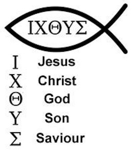 The fish symbol is a primitive drawing of a fish made of two curving lines, or arcs. In the early days of persecution, it is said, if two Christians met they could identify themselves to each other by this symbol. One would draw an arc in the sand, and the other would draw a reverse arc to fashion the shape of a fish. There are two reasons this a powerful symbol. One is the reference in the Bible to Christians being fishers of men. The other is the fact that the Greek word for fish, ichthus, also forms, in Greek, the first letters of the words "Jesus Christ, Son of God, Savior." Thus, this simple symbol is like a secret code. Today the fish symbol is especially popular among evangelical Christians. [Source: Encyclopedia.com]