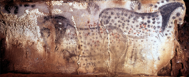 Lascaux Caves is one of the world's most famous prehistoric caves. Consisting of one great chamber and two passageways, it is located near Sarlat on a hillside in Montignac, in the Dordogne region of southwest France. The 17,000-year-old painting are rendered with great skill, incorporating the contours of the caves and displaying some of the first known use of perspective, a technique that was not rediscovered until the Golden Age of Greece, as well as shadowing, highlighting, stenciling, and Pointillism. The artists used powdered colors, brushes and stumping clothes and spit pigment out of their mouth. Based on the hand prints left in the caves, the artists including males and females of all ages and even babies. After Picasso visited the cave in the 1950s was he reportedly emerged and exclaimed: "We have invented nothing." Miró once said, "Painting has been in a state of decadence since the age of caves."
