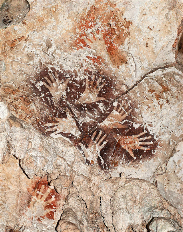 4) Chauvet-Pont-d'Arc Cave, France (c.30,000 B.C.): In total, the cave contains 12 red ochre hand prints, 9 hand stencils and some 450 palm prints — mostly on the Panel of Hand Stencils in the Gallery of Hands. In the Panel of the Red Dots, a cave painting discovered close to the cave entrance, there is a cluster of large dots, roughly in the shape of a mammoth. The dots were made by dipping the palm of the right hand into red paint and then applying it to the wall.