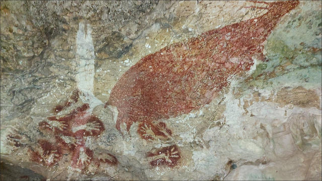 1) Sulawesi Caves, Indonesia (around 40,000 years old): The world's oldest recognized hand stencil comes from the Leang Timpuseng Cave in the Maros-Pangkep karst area on the Island of Sulawesi. The site also includes some of the most ancient animal paintings. Perhaps they were made by migrants who ultimately made their way to Australia. The Indonesian painted caves at Maros in Sulawesi are also famous for their hand stencils.[Source: Permanent Delegation of the Republic of Indonesia to UNESCO, 2015]
