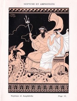 Poseidon (Neptune to Romans) was the god of the sea and of earthquakes and associated with storms and other natural disaster and violent forces of nature. Zeus's brother, he lived in an underwater golden palace and traveled around on a wave-skimming sea-shell chariot pulled by snow-white horses. His attendants included dolphins, Nereids and Tritons. He carried a trident with a three-prong spear. Poseidon appears in Homer's "Iliad" and Hesiod's "Theogony."