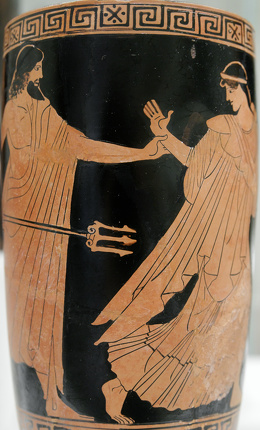 Quarrelsome, surly, petulant and greedy were some of the adjectives used to describe Poseidon and he was reputed to hold a grudge for a long time. Quick to anger, he directed his fury at anyone who acted against him or failed to show proper respect. When angry, he could stir the sea to a fury, but he could also calm the raging waters with just a glance. Another name for Poseidon was Hippios, meaning lord of horses, a reference to the fact that he was believed to be the creator of the first horse. [Source: Encyclopedia.com]