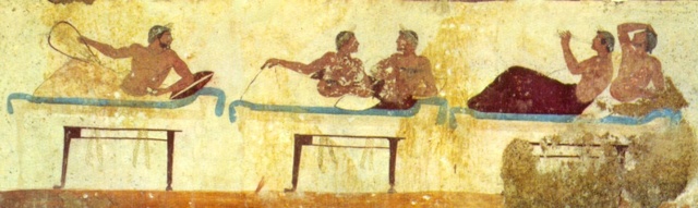 In Athens and elsewhere in ancient Greece it seems large common banquets were relatively frequent among men and were different from the usual family meal. The custom of entertainments for men alone was far more common in antiquity than at the present day; for these banquets took the place not only of our parties and other social gatherings, but they also gave the men an opportunity, especially in the drinking which followed, while sitting together over their wine, to discuss at their leisure both serious and frivolous matters. [Source “The Home Life of the Ancient Greeks” by Hugo Blümner, translated by Alice Zimmern, 1895]